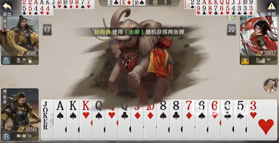 大象坐骑在准备阶段强制随机补两张手牌,无选择权。该效果双刃性明显:可能凑成高价值组合(如炸弹、完整顺子),也可能仅得两张孤立散牌,大幅增加手牌管理不确定性,适合擅长风险预判与动态调整的进阶玩家。
