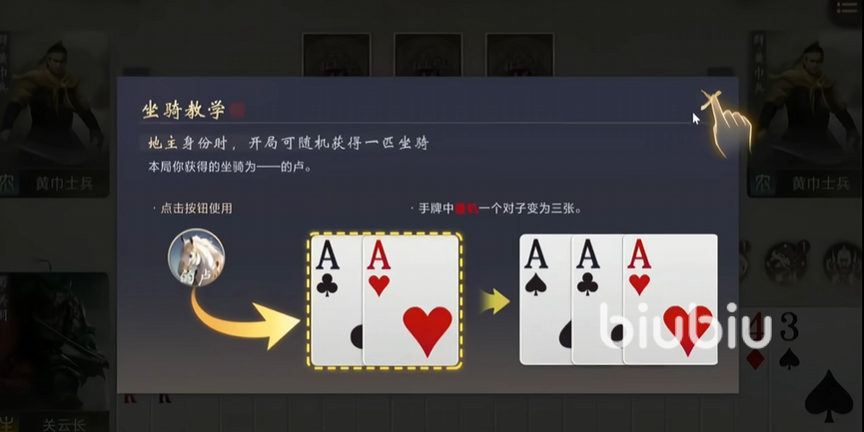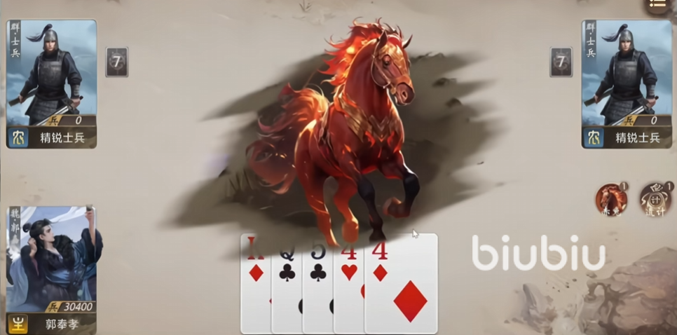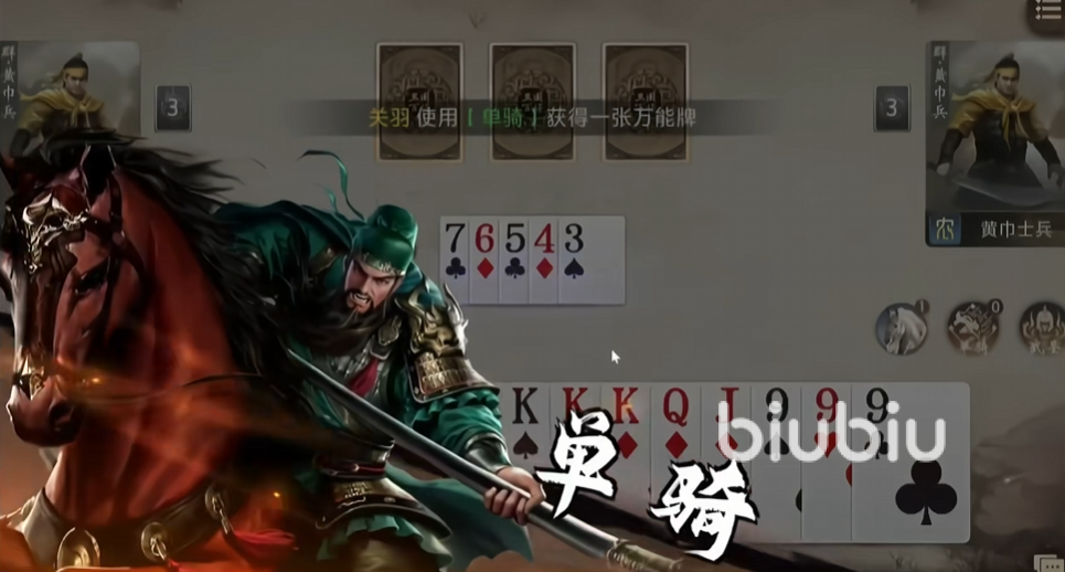赤兔坐骑限定支持五张顺子出牌时减少一张消耗,即打出五顺仅需四张牌,但不可用于四顺、六顺等其他长度顺子;该特性与关羽武将技高度契合,形成稳定压制链。爪黄飞电则专精于三连对场景,每次出三连对均可少打一张牌,无次数上限,技能需手动点击激活,操作响应要求较高。