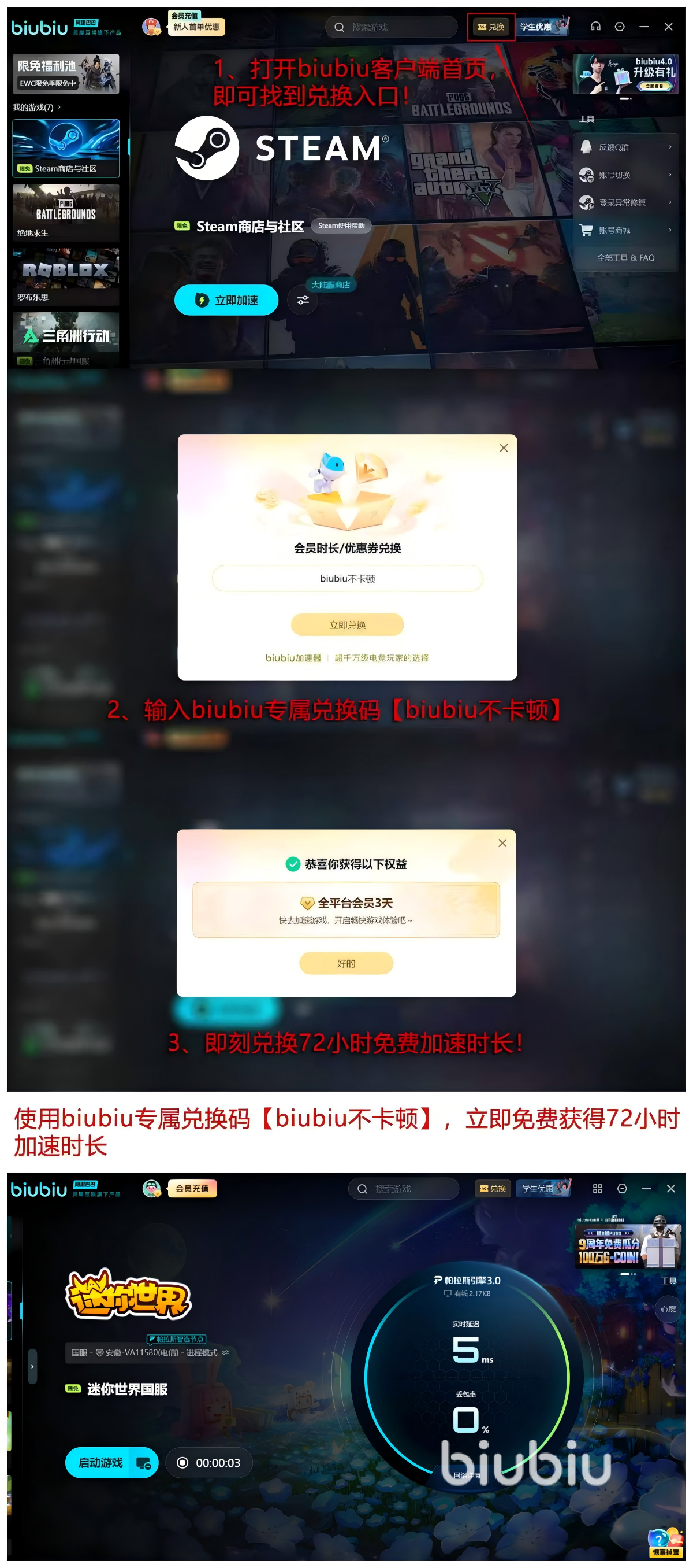 新用户注册后可输入口令【biubiu不卡顿】,立即获得72小时全功能加速权益;叠加新人专属福利,还可额外领取24小时加速时长,总计享96小时免付费体验周期,充分验证产品实际效果后再决定是否续订。
