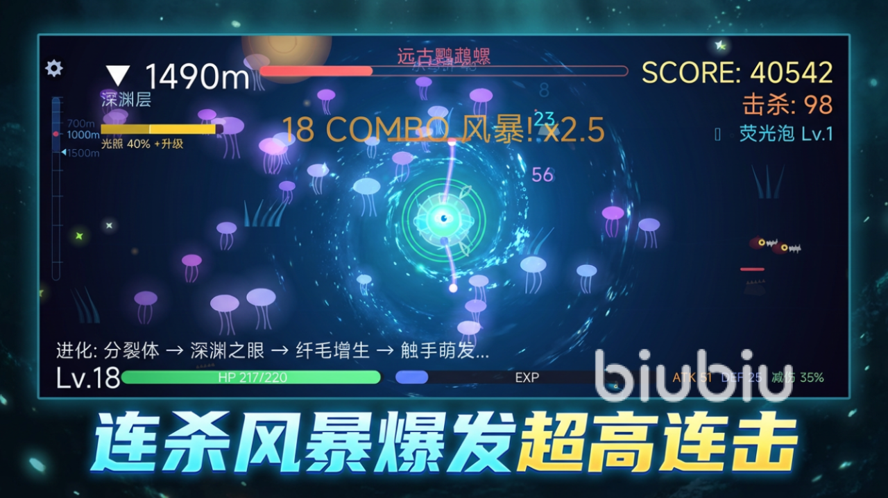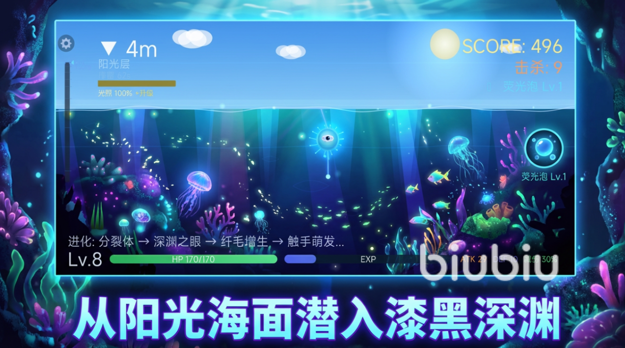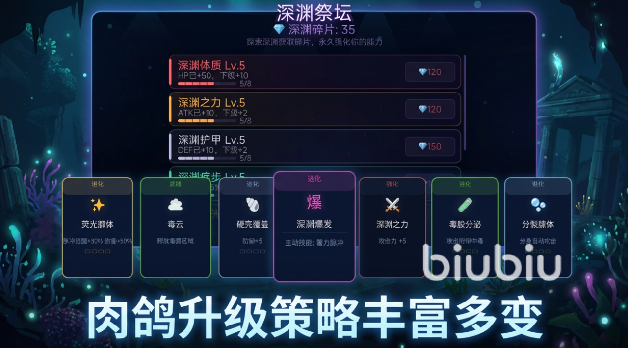 《荧光深渊》的核心魅力在于其高动态性与强策略耦合。游戏摒弃线性成长模型,采用非确定性进化系统:每一轮战斗结束后,系统提供多个不可复现的进化分支选项,包括触手系(爆发型范围清场)、甲壳系(高耐久抗压路线)、毒饵荧光系(持续侵蚀+环境干扰)、激光系(全屏压制输出)等。这些路线并非单纯数值提升,而是从根本上重构操作逻辑与战场定位——选择即定义角色本质。