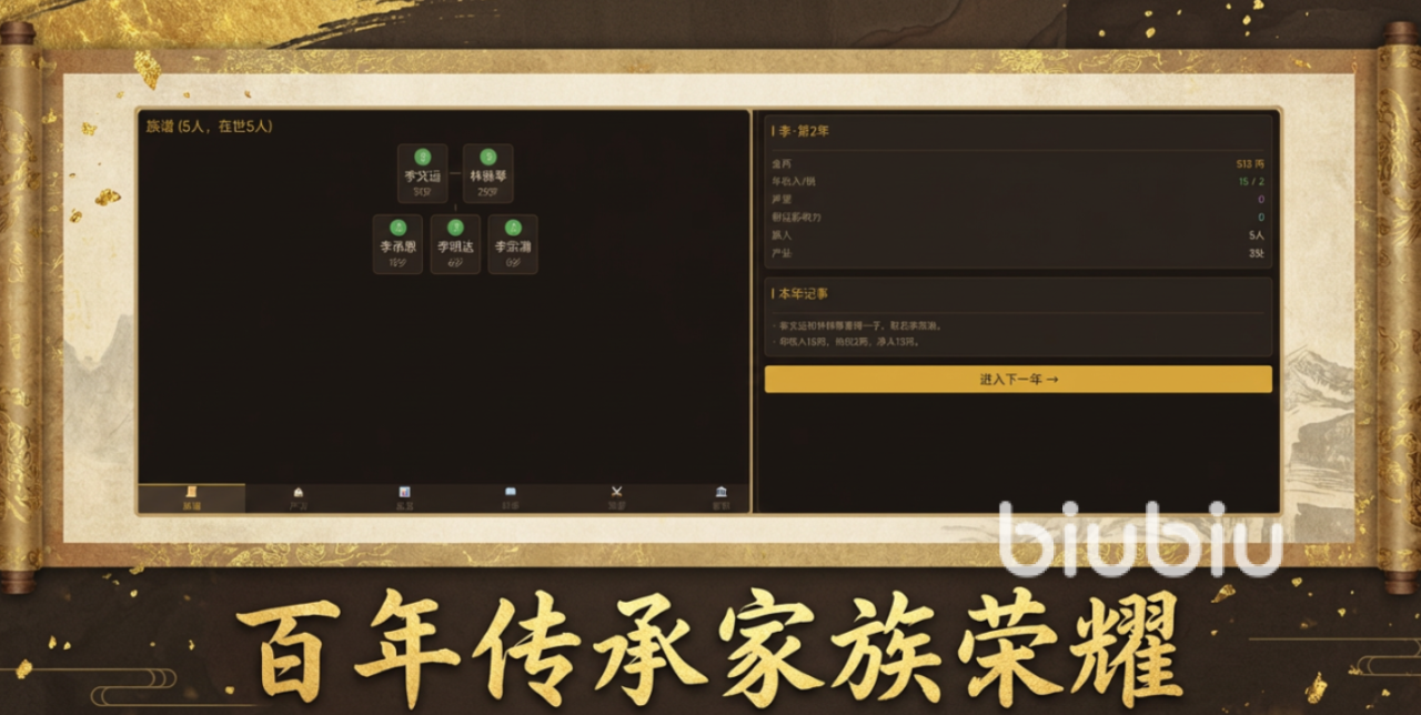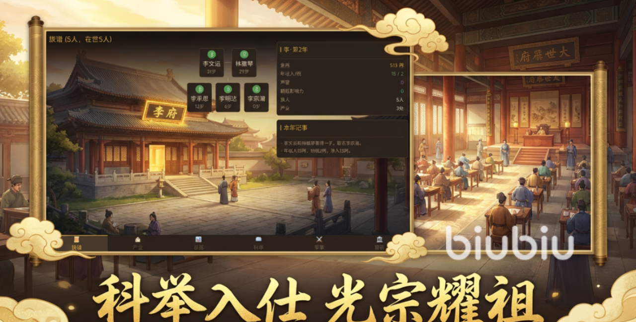 首先,游戏采用代际传承式模拟经营框架,玩家并非操控单一角色,而是统筹整个家族的命运走向。起始仅有一对夫妇,但通过子嗣繁衍、产业布局、科举应试、沙场建功或朝堂任职等多种方式,持续提升家族的财富积累与社会声望。目标明确:确保家族血脉延续、基业长青。