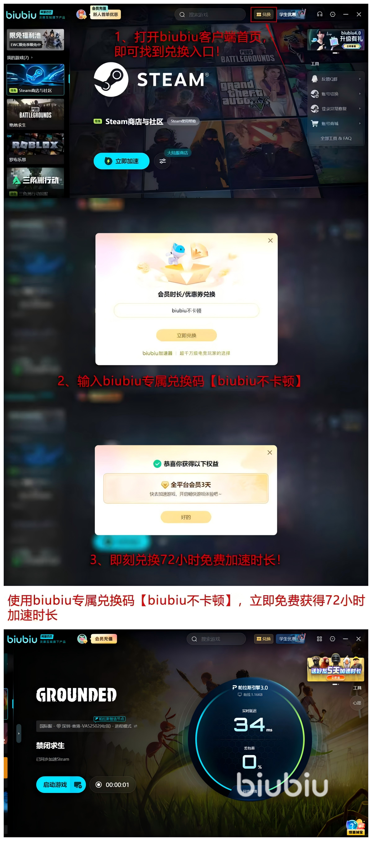 新用户输入口令【biubiu不卡顿】即可立即领取72小时全节点加速权限,叠加首日新人专享24小时加成,总计可享96小时无限制加速服务。该策略遵循“先体验、后决策”原则,降低使用门槛,助力玩家无缝接入联机生态。
