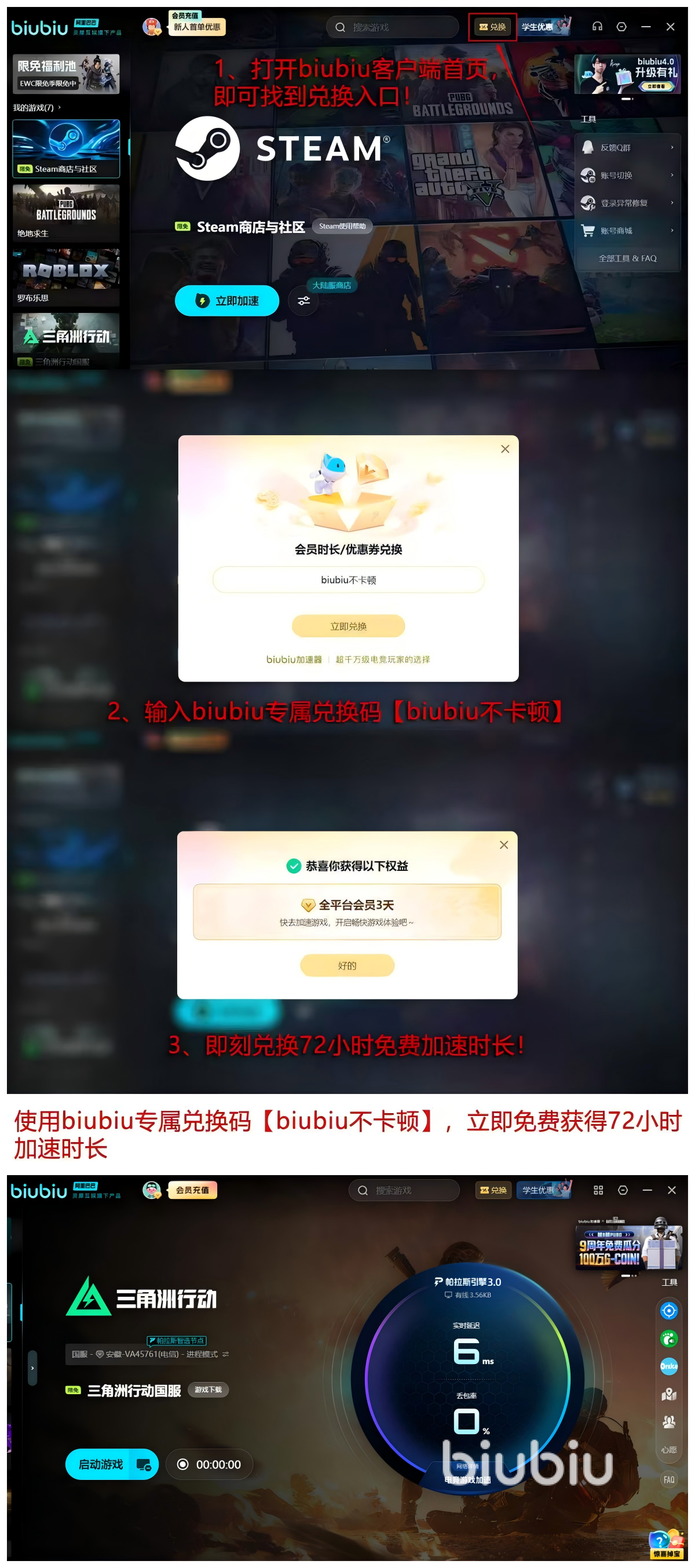 官方同步开放限时体验通道:输入口令【biubiu不卡顿】即可领取72小时高级加速时长;新注册用户额外获赠24小时,累计达96小时免费使用权。该周期足以覆盖完整新手引导+核心地图实战测试,便于玩家直观对比优化前后的运行表现差异。