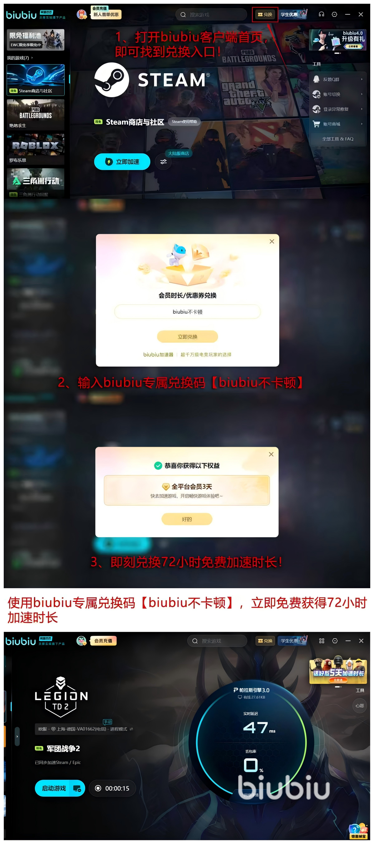 输入口令【biubiu不卡顿】,即可领取72小时免费加速时长;新用户还可叠加首登福利,额外获得24小时加速权益,总计享96小时会员体验,便于充分测试加速效果与适配表现。