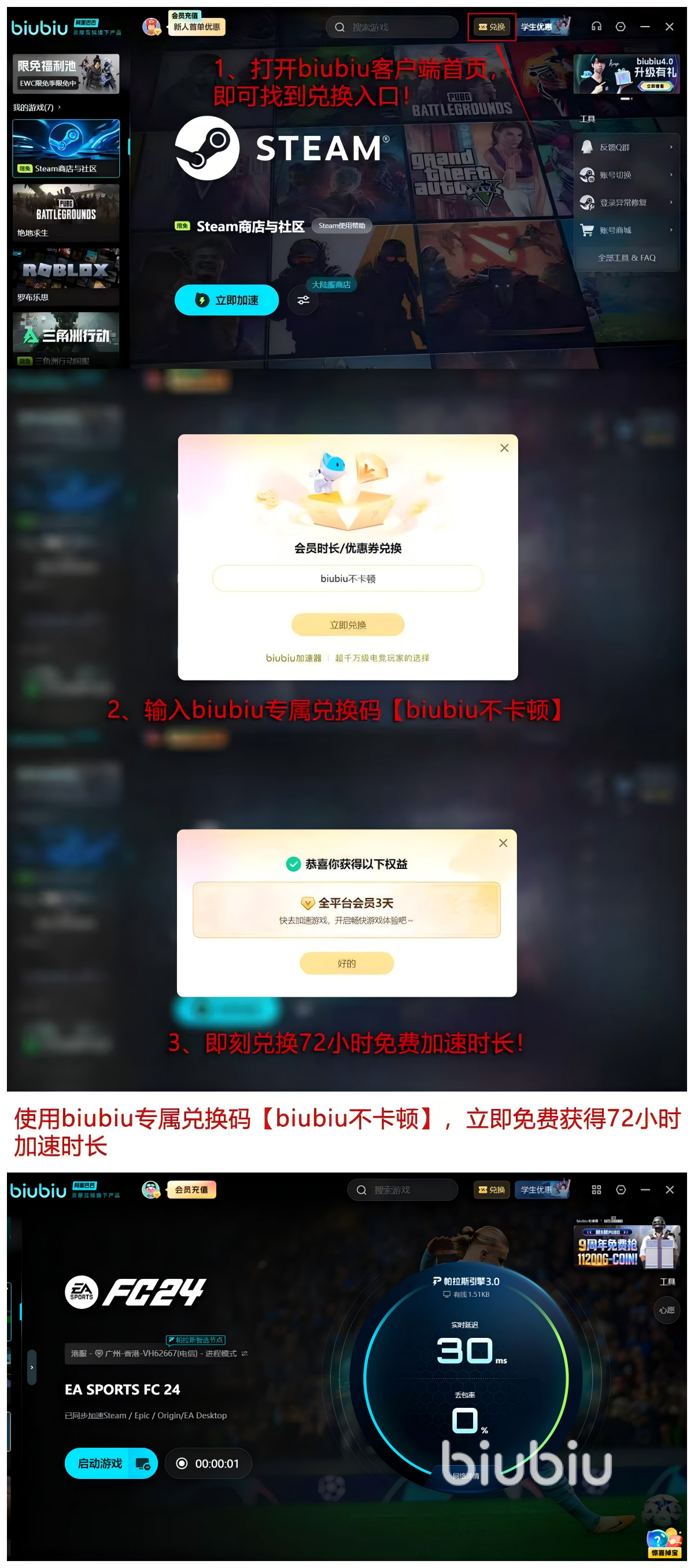 新用户可通过输入专属口令【biubiu不卡顿】,即时激活72小时高级加速权益;叠加首次注册赠送的24小时体验时长,总计可享96小时连续加速服务。所有权益均为即领即用型,无需绑定设备或等待审核,适用于临时排位赛、关键友谊赛或大型线上锦标赛等高优先级使用场景。