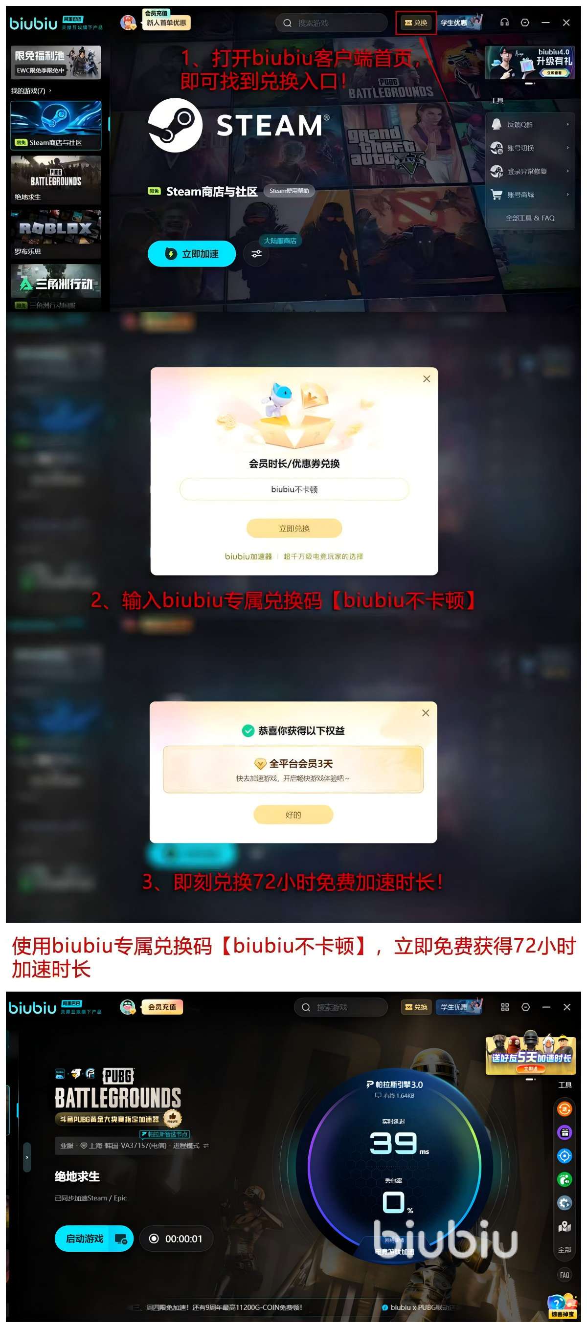 新用户可输入口令【biubiu不卡顿】,立即兑换72小时高级加速服务;叠加注册即赠的24小时新人权益,总计可享96小时无限制加速体验。该时长足以覆盖完整新手适应周期及多场高强度对局,便于充分评估其实际加速效果与系统兼容性。
