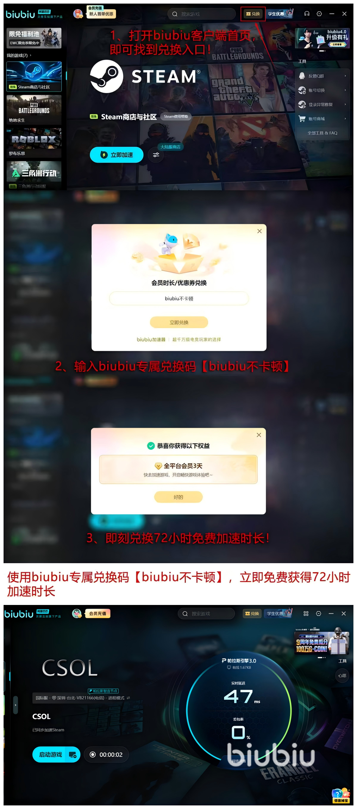 新用户请牢记口令【biubiu不卡顿】,输入后即可领取72小时全功能会员权益;叠加新人首登奖励,还可额外获得24小时加速时长,总计达96小时免费使用额度。