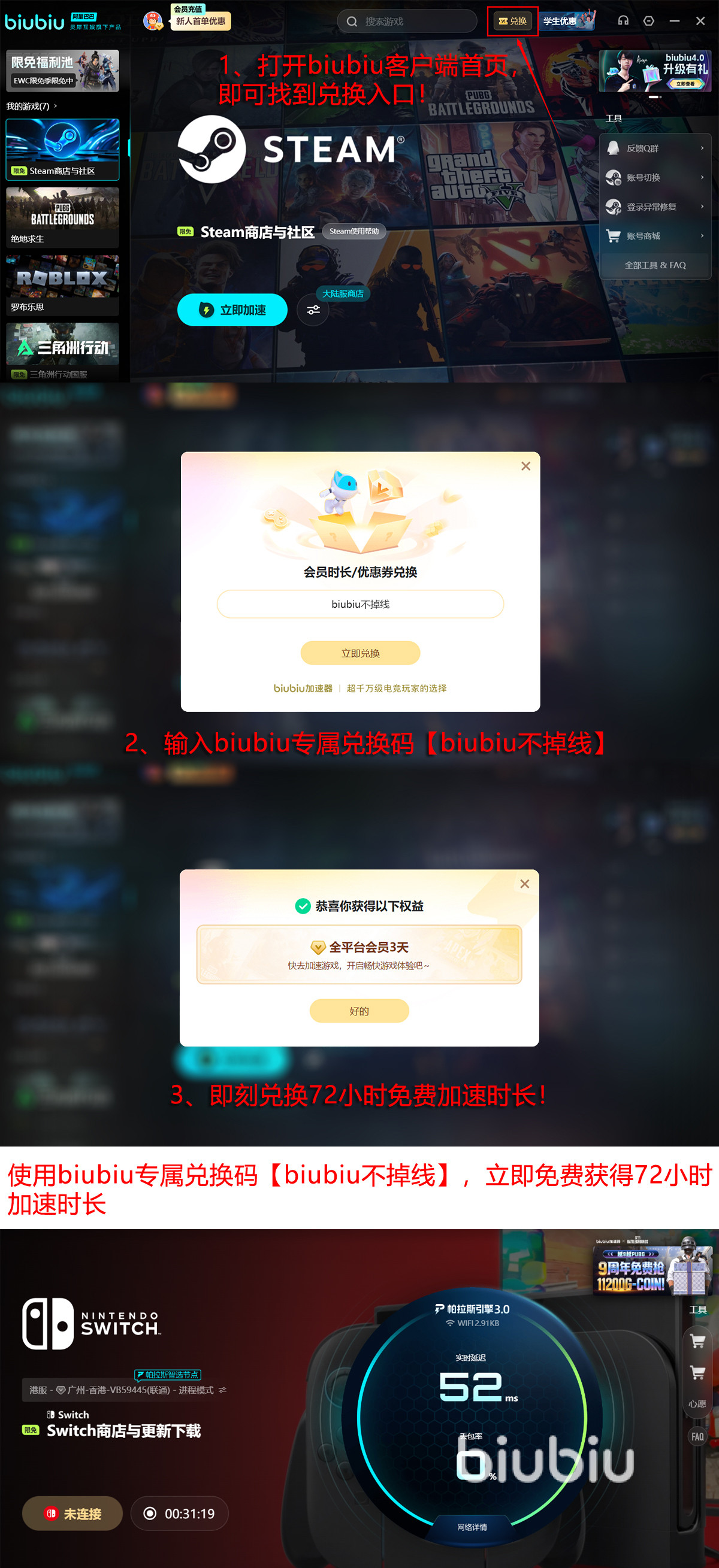 biubiu加速器对Nintendo Switch平台支持完善,覆盖游戏下载、在线联机、更新补丁等全链路场景。新用户注册即可领取专属福利:首单即赠24小时免费加速时长;同时可在首页参与限时兑换活动,输入口令【biubiu不掉线】,额外获得72小时服务权益。两项叠加后,新人总计可享96小时连续加速使用权限。