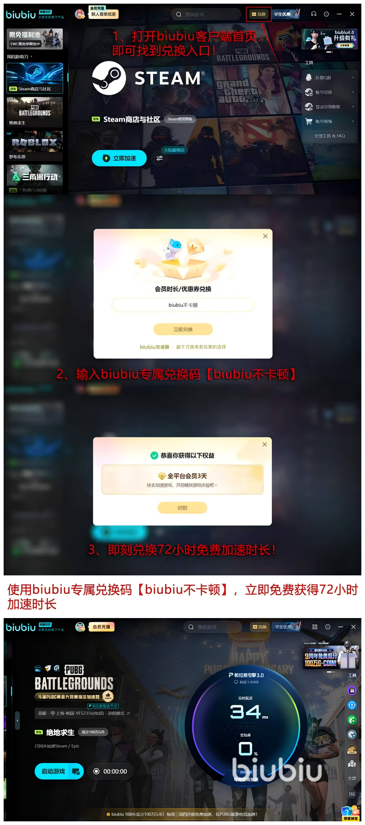 新用户可通过口令【biubiu不卡顿】直接领取72小时全功能加速时长;已注册用户叠加首充权益后,最高可享总计96小时连续加速服务,覆盖完整四日深度测试周期,便于全面评估其在不同网络环境下的实际效能。