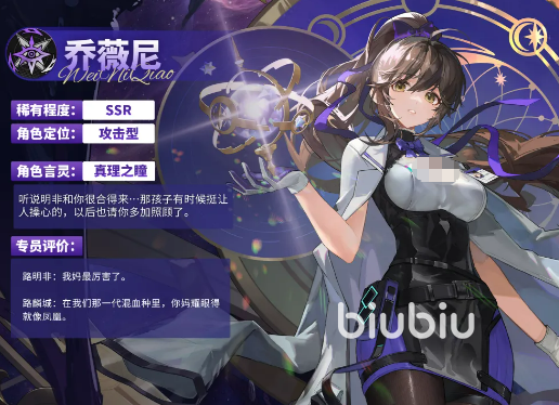 乔薇尼为SSR稀有度角色,定位明确——高强度法术输出核心。她的普攻名为“真知湮灭”,具备智能索敌逻辑:自动锁定敌方单位数最多一排中当前生命值最低的目标,施放单体法术伤害,并附加“全伤害易伤”状态。该状态使目标受到的所有类型伤害(物理、法术、真实等)均提升固定比例,是贯穿整场战斗的基础减防手段。值得注意的是,普攻不仅是伤害来源,更是后续增益循环的启动键,因此在行动资源允许的前提下,应优先保障其释放频次。
