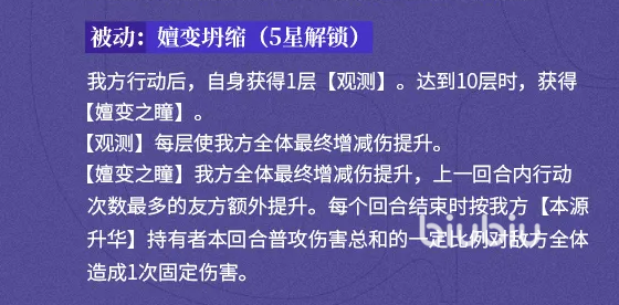 五星进阶后激活核心被动“嬗变坍缩”,彻底释放乔薇尼的战术上限。我方每名角色完成一次行动,乔薇尼即积累1层“观测”;满10层后,“观测”将质变为“嬗变之瞳”,大幅提升我方全体最终增减伤效果。同时,上一回合行动次数最多的友方单位还可获得额外增幅。更关键的是,每回合结束时,系统将根据我方所有“本源升华”持有者当回合普攻总伤害,对敌方全体追加一次固定数值的法术伤害——相当于每回合稳定提供一次无消耗的群体补刀。