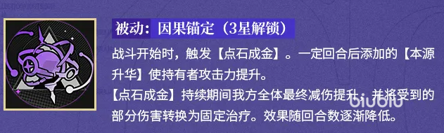 达到三星后解锁被动“因果锚定”。该效果在战斗开始时自动触发“点石成金”,为我方全体提供最终减伤加成,并将部分所受伤害转化为固定数值治疗。该效果随回合推进逐步衰减,但为队伍前中期生存提供了关键缓冲。此外,当战斗进行至指定回合后,“本源升华”持有者还将额外获得攻击力提升,进一步强化持续输出能力。此被动侧重开局容错与节奏过渡,是队伍稳定性的重要保障。