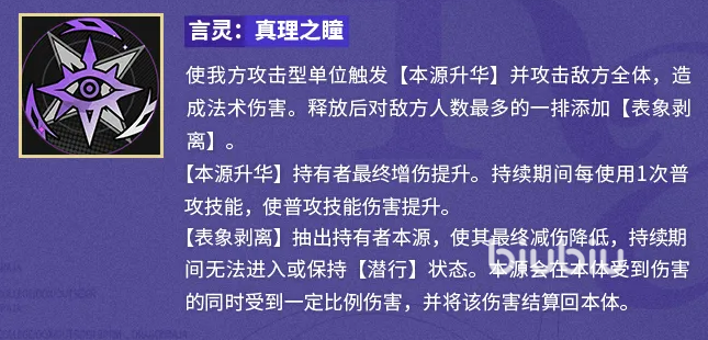 一技能“言灵·真理之瞳”是乔薇尼的战术中枢。释放后,对我方全体攻击型单位施加“本源升华”状态,并对敌方全体造成一次法术伤害;同时,在敌方单位数最多的一排施加“表象剥离”。其中,“本源升华”可提升持有者最终增伤效果,且每次普攻命中都将叠加额外增伤层数,形成越战越强的滚雪球机制。“表象剥离”则具有双重压制效果:一方面,处于该状态的敌人无法进入或维持潜行,直接封锁其规避类战术;另一方面,该状态会生成一个与本体同步承伤的“本源”,本源所受伤害按比例反哺至本体,实质构成一次额外的间接伤害反馈。