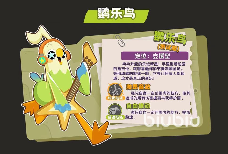 该角色形象设定为怀抱吉他、富有舞台感染力的音乐系战士。其终极技能“激昂音波”具备范围性队友强化效果:在指定区域内,可同步提升友方单位的伤害输出能力,并为其附加可吸收伤害的护盾。实战中常表现为后排持续弹奏、前排高效收割的协同节奏——当主力输出已具备较强压制力时,叠加鹦乐鸟的增益后,清场效率与团战胜率将显著跃升。