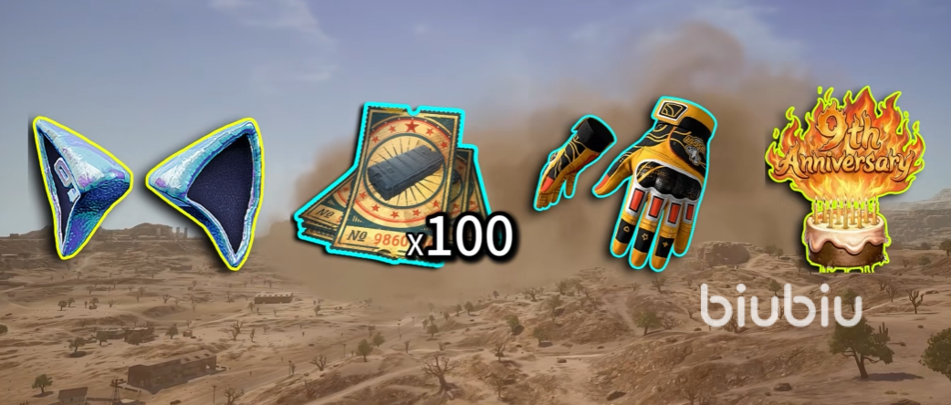 版本更新完成后,每日18:00起可使用以下四组官方授权兑换码,在游戏内商城兑换对应道具:【PUBG9TH】、【PUBG9CNTHX】、【9ZHOUNIANXIEXIE】、【PUBG9WITHCN】。可获赠猫耳头饰、生日蛋糕喷漆、定制铭牌及限定票券等多类装饰性道具,无时间限制,长期有效,支持重复登录后随时领取。