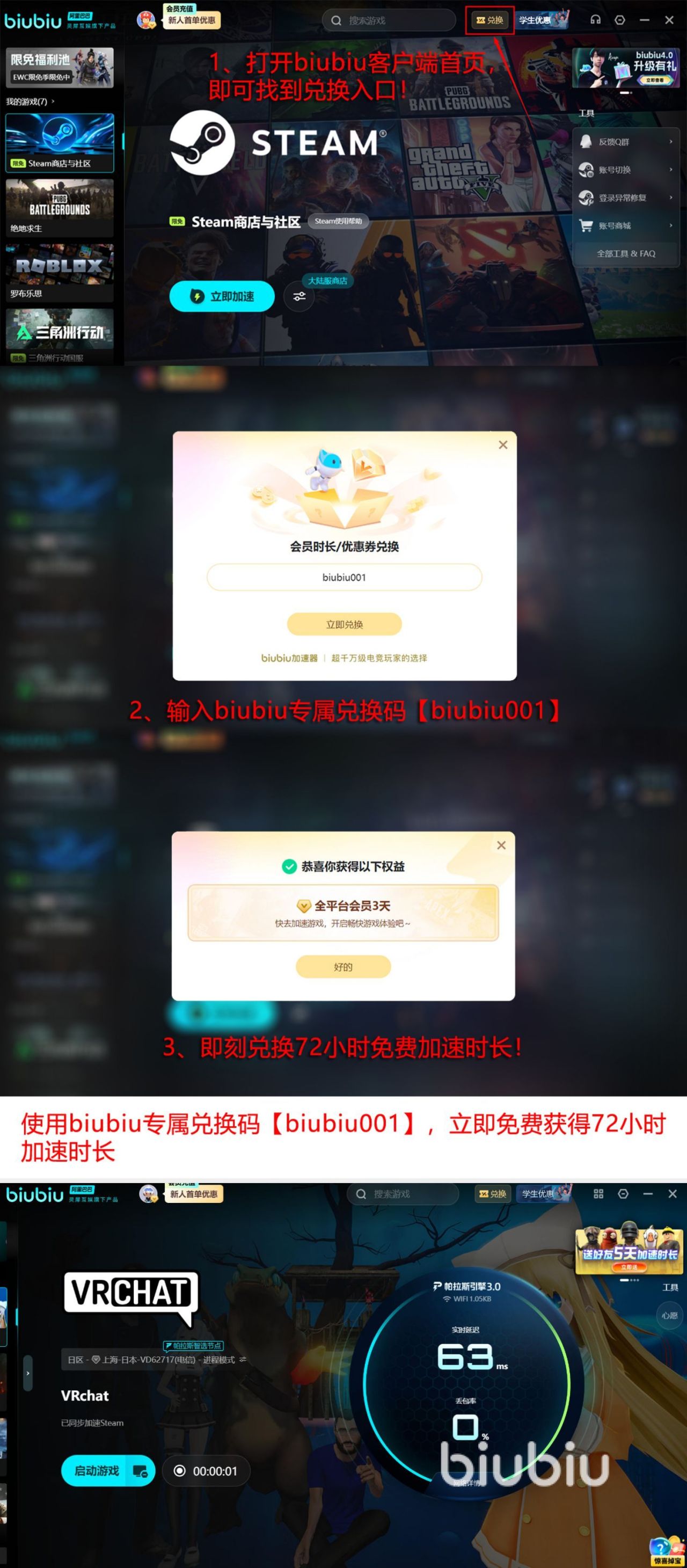 该工具已被多个职业电竞团队纳入日常训练辅助方案,亦获得知名电竞选手小叮当公开推荐。为便于用户体验,平台提供多重免费试用权益:新用户注册即赠24小时加速时长;所有用户均可通过输入兑换码【biubiu001】领取三天加速服务;累计最高可享96个小时免费使用额度。