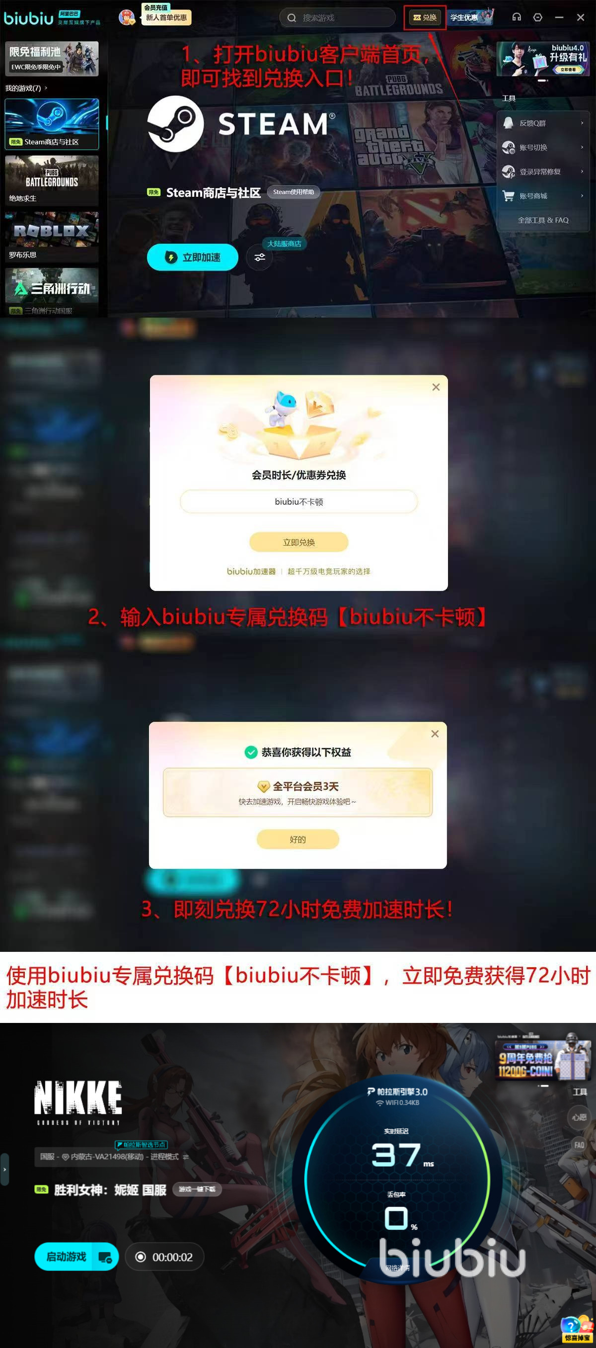 为帮助新用户快速建立稳定连接体验,biubiu加速器推出专项新人激励计划:完成注册后首日即可解锁全部功能权限,享24小时无限制加速服务;另输入专属口令【biubiu不卡顿】,还可额外获赠72小时加速时长。两项权益叠加后,新用户总计可获得96小时高质量网络加速支持,大幅缩短连接异常修复周期。
