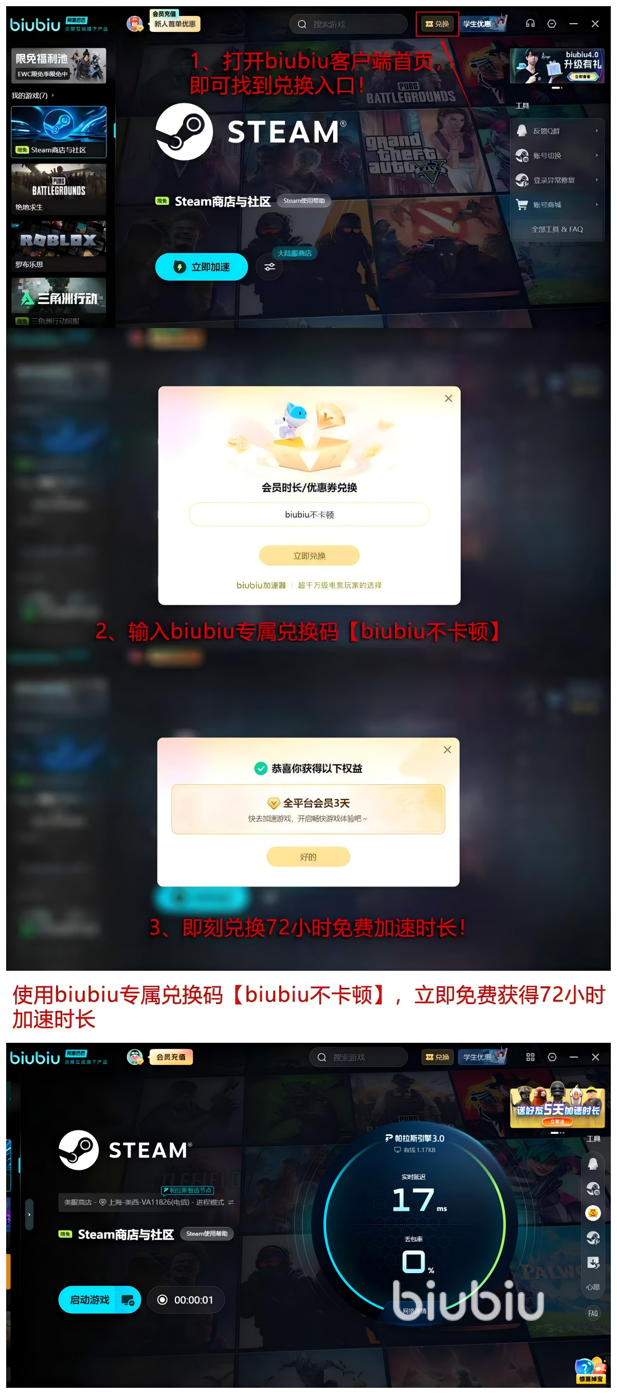 输入口令【biubiu不卡顿】即可激活72小时高级加速服务,新用户额外享24小时专属加速权益,合计可获得96小时免付费加速时长,适用于Steam平台全场景加速需求,包括客户端启动、游戏库同步、云存档上传及多人联机匹配等核心环节。