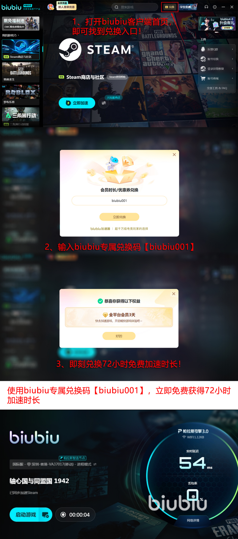 更是一款被 PUBG冠军选手小叮当指定使用的软件,确实会拥有比较好的优势,整体的稳定性还是很好的,行业的认可度确实比较不错。在启动加速器之后,选择对应的区服就可以一键加速,就能迅速的打通网络的壁垒,无论是联机对战又或者是加载大型MOD都可以保持流畅的运行,有效告别画面卡顿还有指令延迟。更让人惊喜的是,这款加速器还有专属的免费福利。使用兑换码【biubiu001】可直接领取3天免费加速时长,新用户在注册之后,还会额外的获得24小时免费加速时长。两种方法搭配在一起使用,那最后就可以免费长达96小时,就等于可以享受4天的免费丝滑体验。