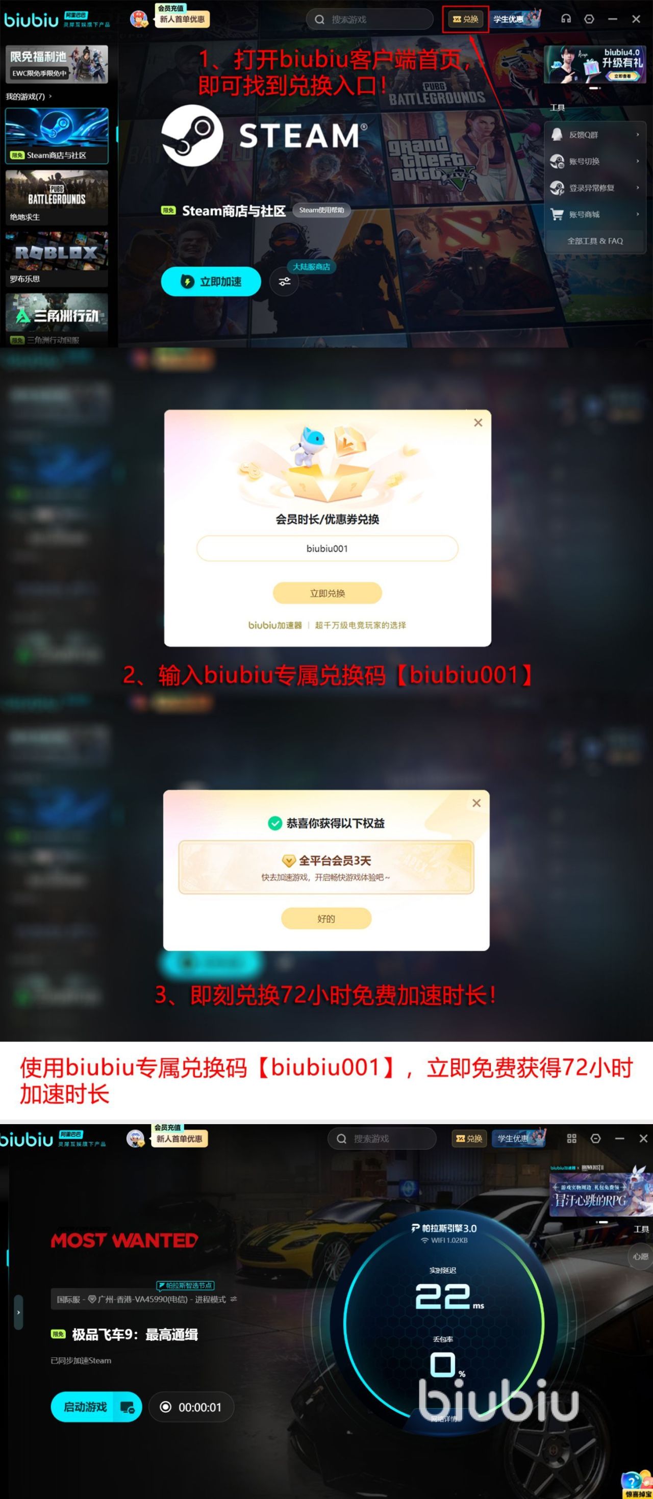 更良心的是,现在还有超多的免费福利,所有的玩家都可以去薅羊毛。新老用户都可以利用【biubiu001】申请兑换3天的免费加速时长,并不需要额外的支付费用。另外新用户有一个24小时的免费礼包,在首次注册登录之后,就可以获取。结合两种方法,新用户可以免费长达96小时,足够大家畅玩这款游戏,所以这简直就是一个福音。