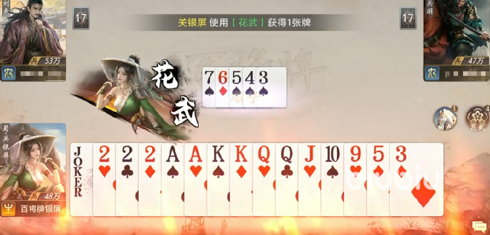 核心被动“花武”具有明确触发条件与收益逻辑:当任意玩家打出点数≥4的连牌(如顺子、同点数多张组合等),关银屏即随机获得一张J、Q或K。该机制不依赖自身出牌,全程由全局牌型驱动,确保中后期手牌质量持续提升,为关键回合爆发奠定基础。