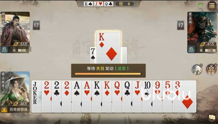 实战中,若关银屏处于地主位置,可主动构建长牌型输出节奏。凭借先手权频繁触发“花武”,加速J/Q/K积累。配合爪黄飞电、赤兔等地主专属坐骑,有效降低多张连牌的出牌门槛,强化控场能力与压制效率。