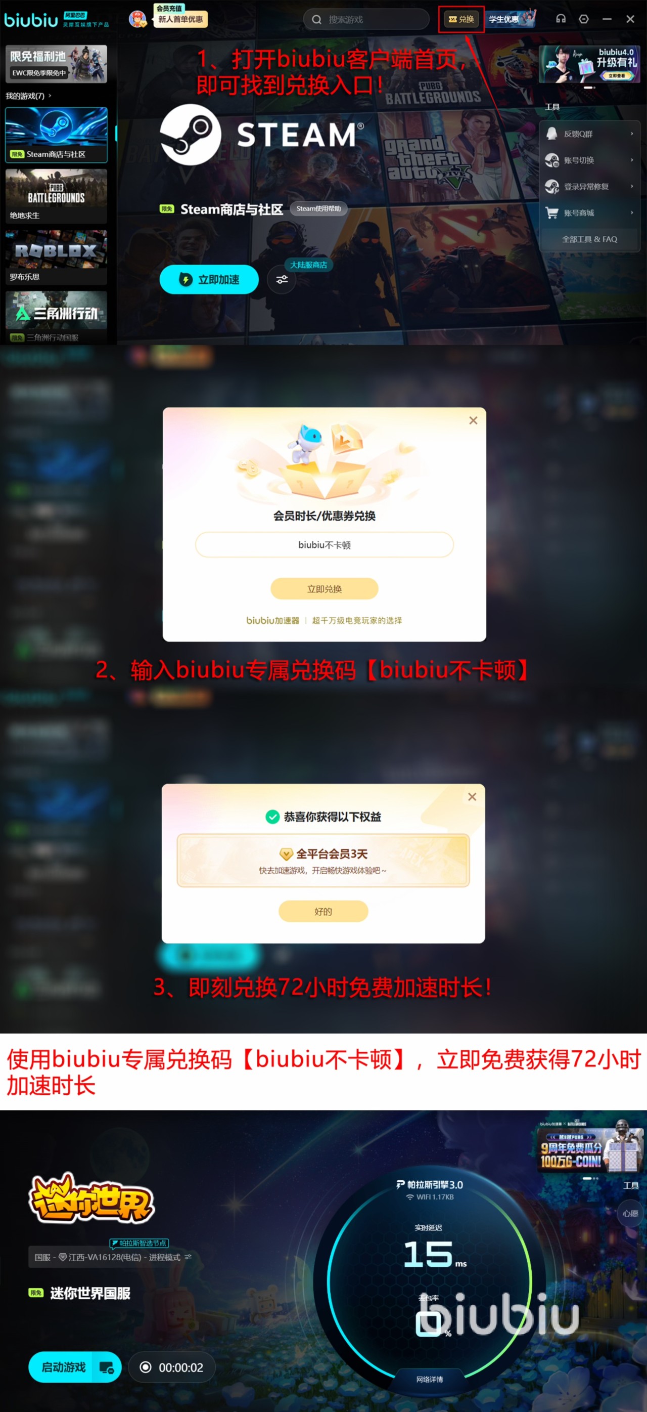 在服务模式方面,biubiu加速器提供面向新用户的友好权益机制:首次注册即可立即获得24小时免费加速时长;所有已注册用户,无论账号激活时间长短,均可在客户端界面输入口令【biubiu不卡顿】,兑换一次为期3天的连续加速服务。