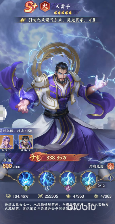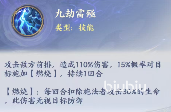 天雷子的核心输出手段并非依赖普攻,而是主动技能【九劫雷殛】:对敌方前排目标造成110%攻击力的伤害,并有15%概率附加持续1回合的燃烧效果。该燃烧伤害为施法者攻击值的30%,且完全无视目标防御,属于高穿透型持续伤害,在面对高护甲或高减伤阵容时尤为关键。虽然单次触发概率不高,但配合被动叠加与队伍灼烧增益后,整体覆盖率显著提升。