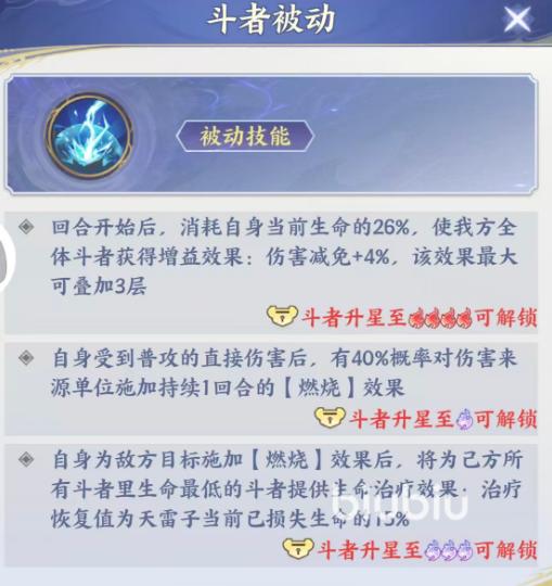 其被动体系随星级提升呈现阶梯式强化。初始阶段,天雷子在每回合开始时消耗自身当前生命值的26%,为全体友方斗者提供增益——每次受击可减免4%所受伤害,该效果最多叠加至3层,即最高实现12%的常驻减伤。升星后,被动进一步拓展:当受到普攻伤害时,有40%概率对攻击者施加1回合燃烧;若该燃烧由天雷子主动触发,则立即为己方生命百分比最低的斗者恢复相当于天雷子当前已损失生命15%的血量。此外,当天雷子阵亡时,还将为全队回复等同于其最大生命值36%的生命,极大延长队伍整体续航能力。