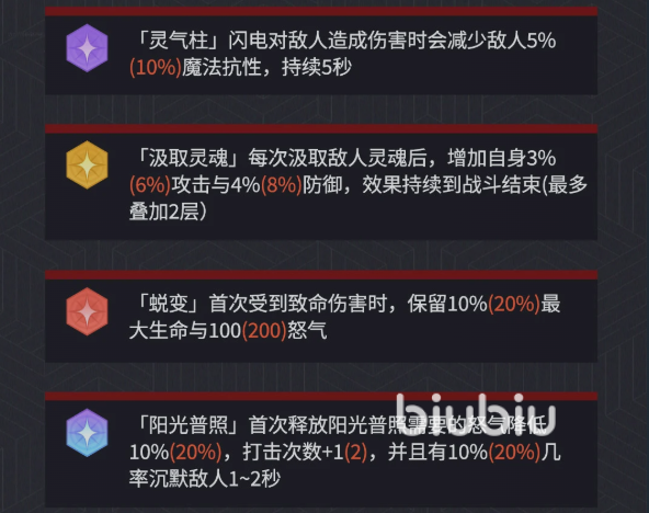 被动能力覆盖爆发、续航与容错三重维度。灵气柱效果可在造成伤害时降低目标5%~10%魔法抗性,持续5秒且可叠加,大幅降低队伍对减抗辅助的需求,直接优化整体输出环境;萃取灵魂每次触发提升3%~6%攻击力,最多叠加两层并持续至战斗结束;蜕变机制提供伪复活保障,首次承受致命伤害时保留10%~20%最大生命值,为反打创造窗口;阳光普照则兼具功能与输出——不仅降低自身奥义怒气需求,还附带概率沉默效果,实现控场与压制同步达成。