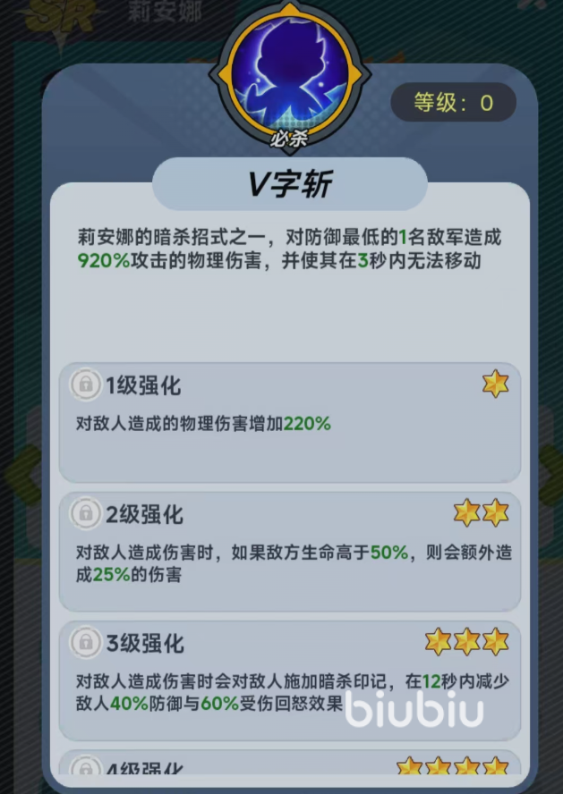 莉安娜的基础技能为“暗杀招式”,具备高额单体物理伤害,并附带强制控制效果,可有效干扰敌方核心角色技能释放节奏;其必杀技则锁定防御最低目标,造成大量物理伤害,并使目标陷入3秒不可移动状态。该双重机制使其在实战中兼具输出与功能性,成为应对高威胁单位的理想人选。