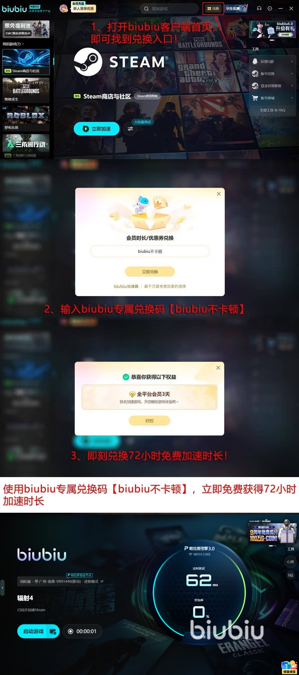 为降低体验门槛,现面向新用户提供分阶段试用权益:完成注册即可激活首日24小时全功能免费使用权;输入专属口令【biubiu不卡顿】,可额外解锁72小时加速时长,累计达96小时无限制高速通道。该周期足以覆盖完整的新手引导、主线前中期流程及基础建造循环,便于用户真实评估其对闪退、卡顿等问题的实际改善效果。