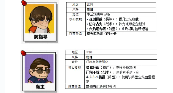 针对防守压力较大的关卡,推荐优先配置防指导与岛主。防指导具备欧洲稳健风格,是中后场防守体系的顶级选择,拥有高强度抢断能力,且体力耗尽时仍可维持断球成功率;适用于需遏制对手推进节奏的高难度防守场景。岛主则属亚洲稳健风格门将型教练,通过强化专属机制提升扑救减伤效果,并有效压低敌方射正率,实现门前区域的高度防护,特别适合失球惩罚严苛的挑战关卡。