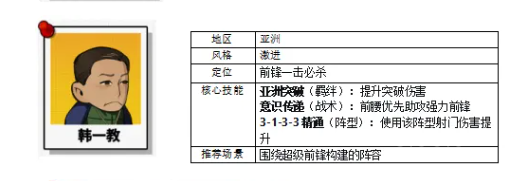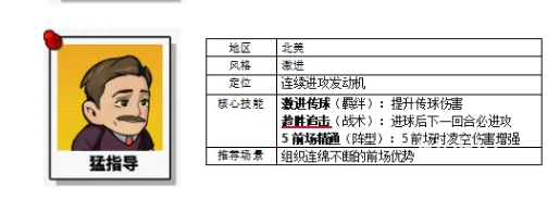 若倾向高强度持续压制打法,猛指导与韩一教是理想组合。猛指导定位为连续进攻发动机,可提升传球伤害,并在进球成功后强制下一回合继续发起进攻,与稳大师搭配可形成无间断进攻链,适用于以进球数为核心目标的多数关卡。韩一教采用亚洲激进风格,专注前锋系强化,其前腰传球逻辑会优先向全技能前锋输送资源,从而最大化射门伤害输出;当队伍中已配备高资质前锋时,该教练能充分释放前场火力潜能。