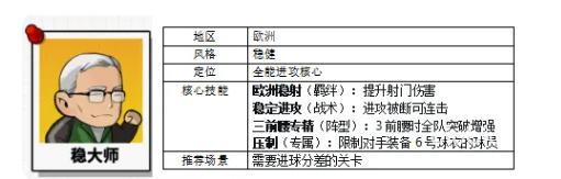 稳大师是当前版本唯一的名帅级教练,采用欧洲稳健风格,定位为全能进攻核心。其核心能力包括:直接提升射门伤害、大幅降低进攻过程中的被抢断概率;专属技能可精准限制敌方6号球衣球员;独有战术“稳定进攻”可在本方进攻被拦截后触发连击效果。无论作为主教练主导战术体系,或作为羁绊关键组件协同其他角色,稳大师均能稳固前场输出节奏,成为高胜率阵容的基石配置。