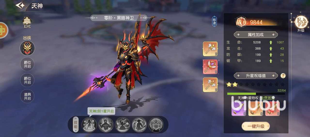 界面中“幻化”功能为核心入口,展示当前可召唤的全部天神。初始仅开放零阶【黑暗神卫】,后续随玩家爵位等级提升逐步解锁其余8位天神,共计9位可选:唤海天神、狂月天神、秩序之神、惩戒之神、凛冬之神、灾厄之神、精灵神卫、战争神卫。每位天神拥有唯一职业定位与技能组合——例如战争神卫专注群体控制与打断,惩戒之神则侧重单体爆发与斩杀机制,技能效果、施放逻辑及数值构成均不可复刻。
