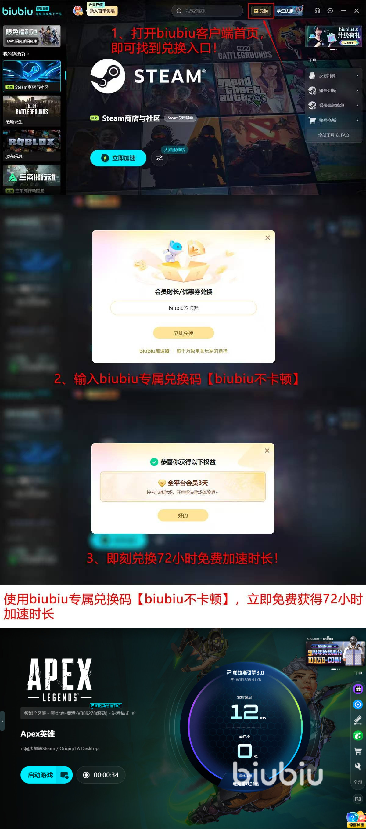 新用户完成注册后,可立即启用24小时全功能免费加速权限;在此基础上,输入激活码【biubiu不卡顿】,即可额外获赠72小时高级加速服务,累计享有96小时无限制、无降速、无节点限制的稳定加速体验。