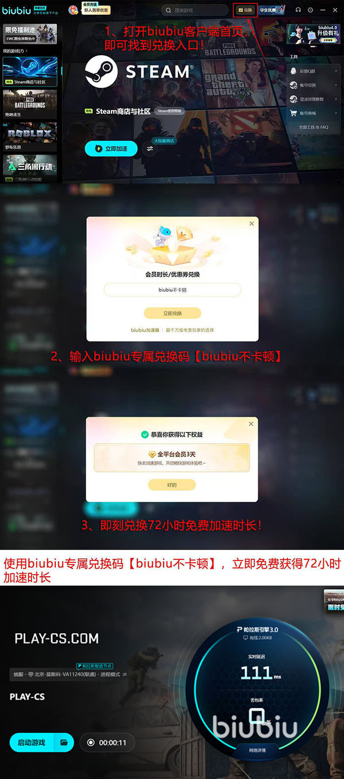 对于CS 1.6玩家而言,操作响应及时性、射击无延迟、画面流畅不卡顿是基础体验门槛。启用biubiu加速器后,多数用户可显著改善闪退频发、帧率波动及输入延迟等问题。目前提供双重免费试用权益:新用户注册即赠24小时全功能使用权;另可通过关键词【biubiu不卡顿】在首页“兑换”入口领取72小时加速时长,两项权益可叠加,总计达96小时。