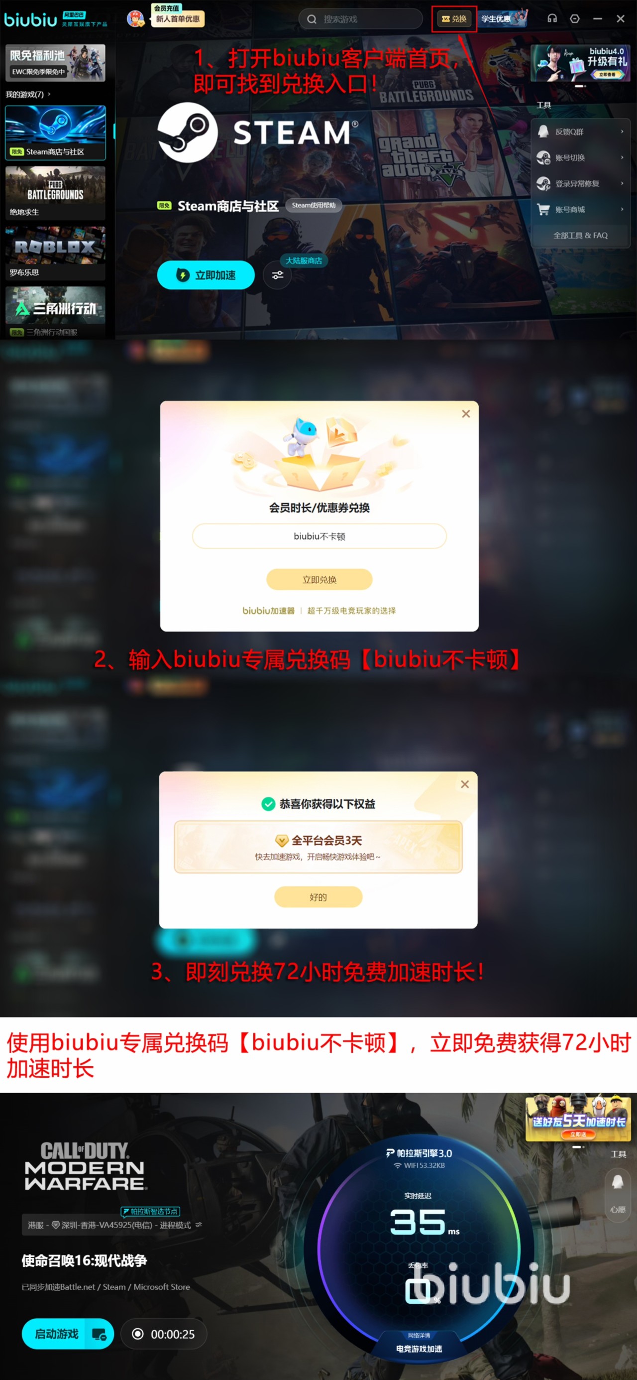 除核心技术外,biubiu加速器在用户权益体系上持续优化。不同身份用户均可匹配专属福利策略。新注册用户享有24小时全功能免费加速权限;所有实名账户还可通过兑换入口领取一次3天高级加速服务,兑换口令为【biubiu不卡顿】。