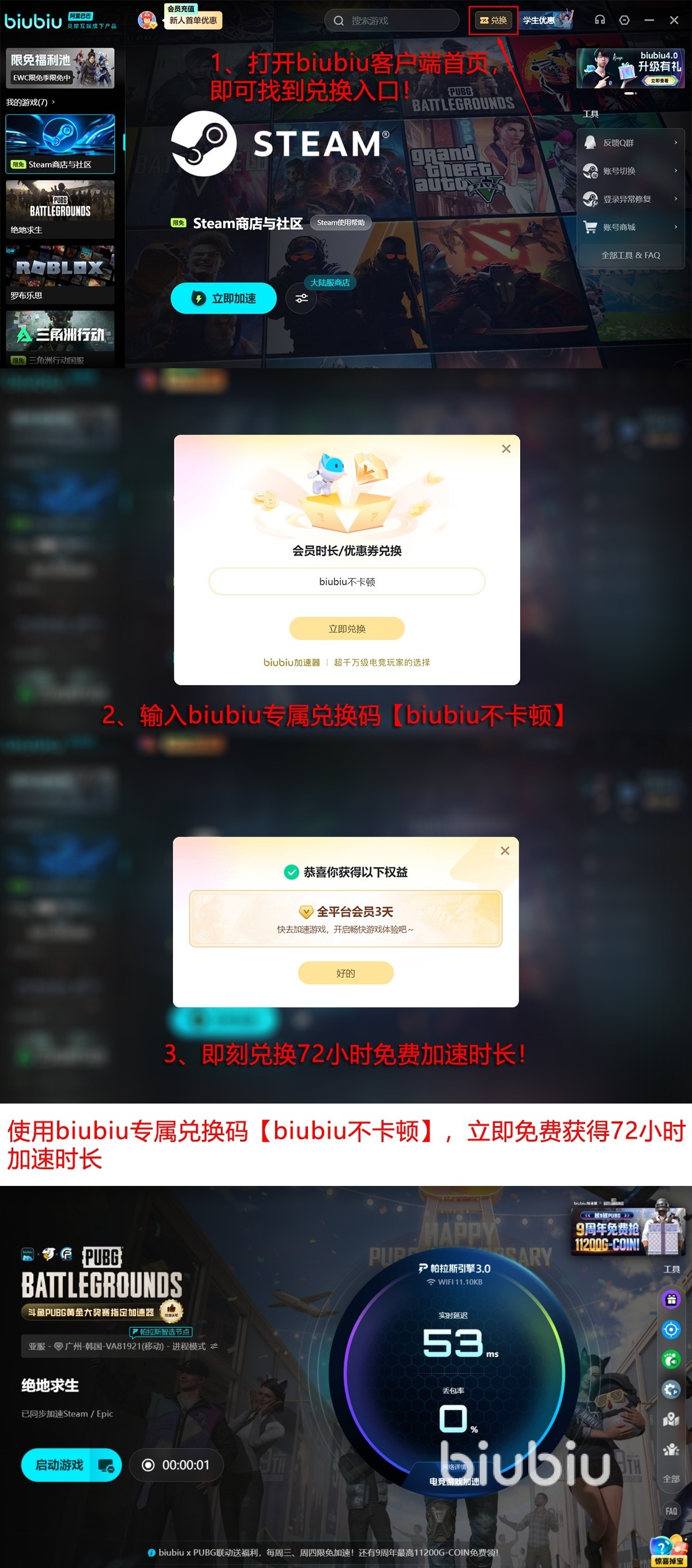 新用户完成注册后,系统将自动开通24小时全功能免费试用权限;输入专属口令【biubiu不卡顿】,还可额外领取72小时加速服务时长,该福利限每位用户领取一次,新老用户均可参与。