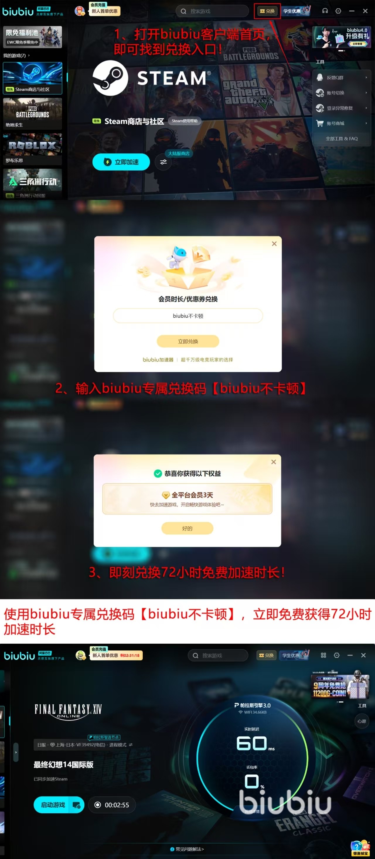 目前biubiu加速器正开展限时福利活动:新用户完成首次注册并登录,即可获赠24小时全功能免费加速时长;所有用户输入兑换码【biubiu不卡顿】,额外领取72小时加速权益。这意味着新玩家在零费用前提下,可连续享受总计96小时的稳定网络服务,从容应对巴埃萨堡垒开荒、水晶塔挑战等对延迟敏感的关键内容。此外,学生群体还可凭有效学籍认证申领专属加速礼包,建议及时参与以免错过权益周期。