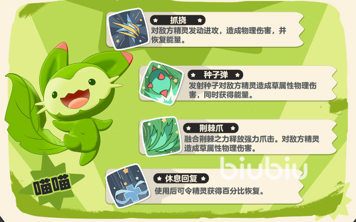 喵喵为草属性精灵,核心特性“氧循环”赋予其持续作战能力:释放任意草系技能后,按技能基础效果比例恢复自身生命值。这一机制大幅降低药剂消耗,延长单次战斗续航时间,使其在探索类任务、多波次遭遇战中稳定性极佳。同时,喵喵技能池覆盖攻击、防御强化与状态干扰,属于攻守兼备的均衡型首发选择,适合重视容错率与流程顺畅度的新手玩家。