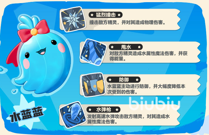 水蓝蓝定位为水系战术型精灵,特性“浸润”可减少所有技能的能量消耗——每次使用水系技能后,全技能下一次释放所需能量值下降。该机制显著提升技能释放频率与连招自由度,便于玩家灵活切换控制、减益与输出节奏,在PVE解谜关卡或需要精准控场的Boss战中表现优异。其成长曲线平滑,中后期可通过技能组合构建多种战术体系。