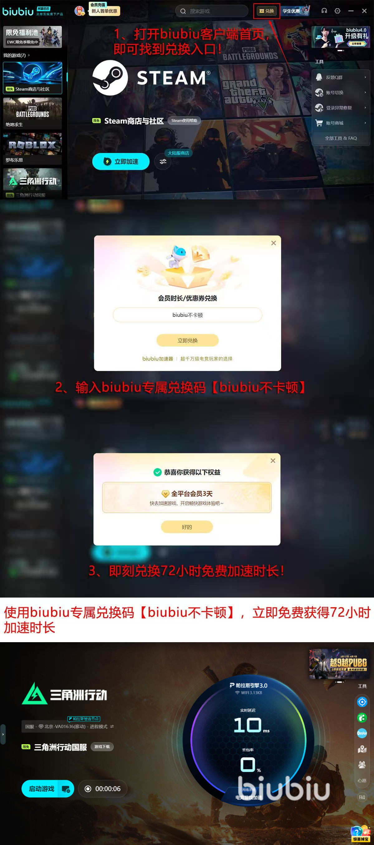 新用户注册即享首日24小时全功能免费试用,输入激活码【biubiu不卡顿】可额外获得72小时加速权益,累计可体验96小时零感知延迟作战环境,真实验证加速效果。
