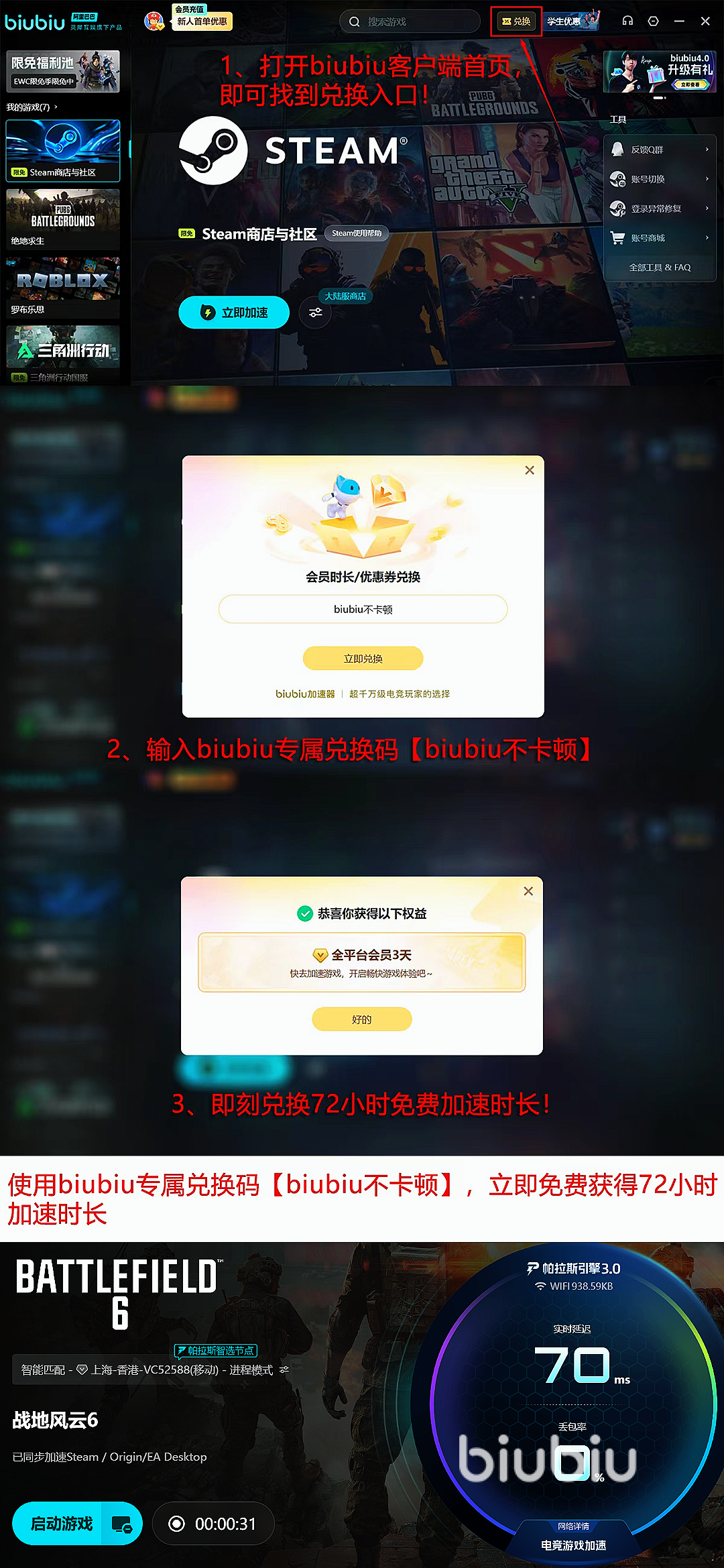 新注册用户可即刻启用24小时全游戏免费加速权限,不限速、不限时长;另在兑换中心输入激活码【biubiu不卡顿】,可叠加领取3天额外加速时长,新用户最高可累计获得96小时免付费使用权益。
