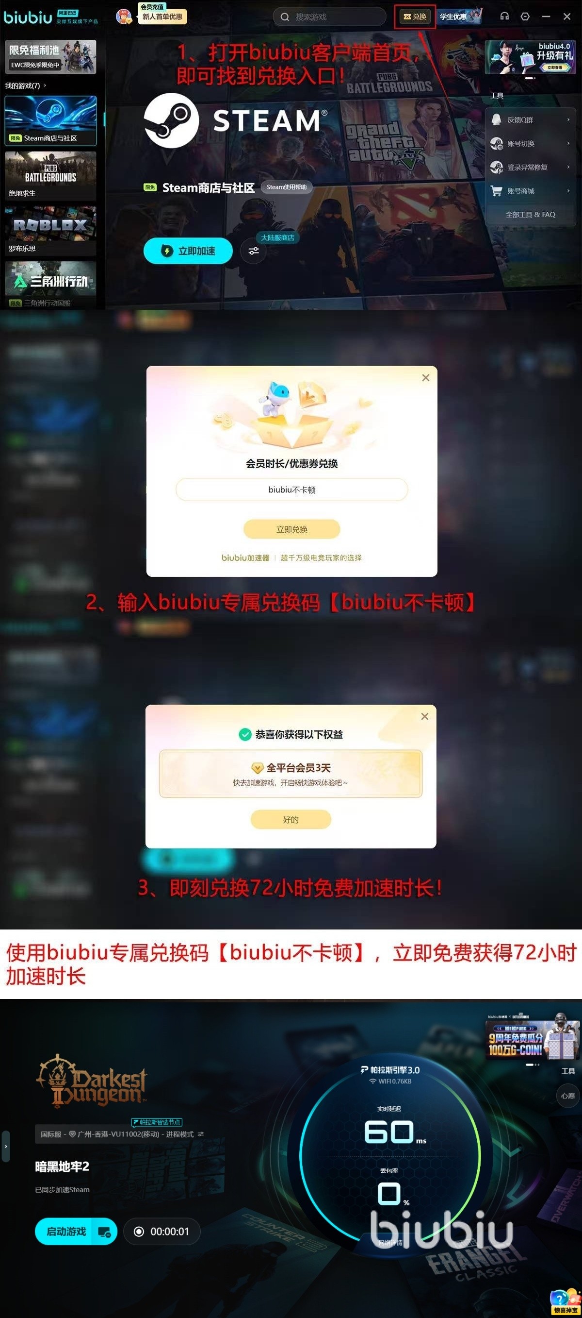 新用户可享双重权益:注册账号后立即获得24小时全功能免费使用权;在激活页面输入专属口令【biubiu不卡顿】,额外获赠72小时高级加速服务。两项福利叠加,总计可体验96小时专业级网络加速,完整覆盖新手入门、章节通关及联机协作等核心使用周期,切实解决登录阻塞问题,助你顺利踏入危机四伏的哥特式地下世界。