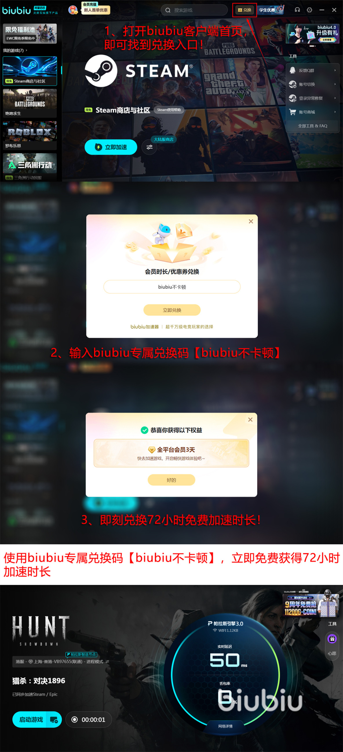 为便于用户实际验证效果,biubiu加速器提供零门槛试用机制:新注册账号自动获得24小时免费加速时长;另可通过输入通用兑换码【biubiu不卡顿】额外领取72小时权益。两者叠加可达96小时连续体验周期,充分覆盖多日测试需求。后续订阅费用具备长期性价比,折合每日成本低于1元,可持续保障《猎杀对决》等国际服游戏的流畅接入体验。