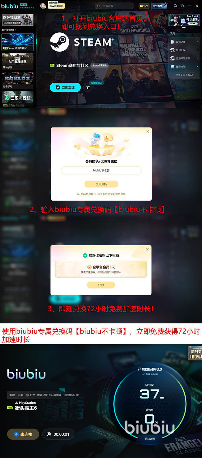格斗游戏对输入延迟容忍度极低,画面撕裂、操作断连、判定延迟均可能直接导致对战失利。若正面临上述困扰,建议优先尝试biubiu加速器免费试用权益:新用户注册即赠24小时全功能使用权;另可通过官网首页“兑换”入口,输入口令【biubiu不卡顿】领取72小时加速时长。两项叠加共计96小时,足够完成多轮压力测试与真实对局验证。