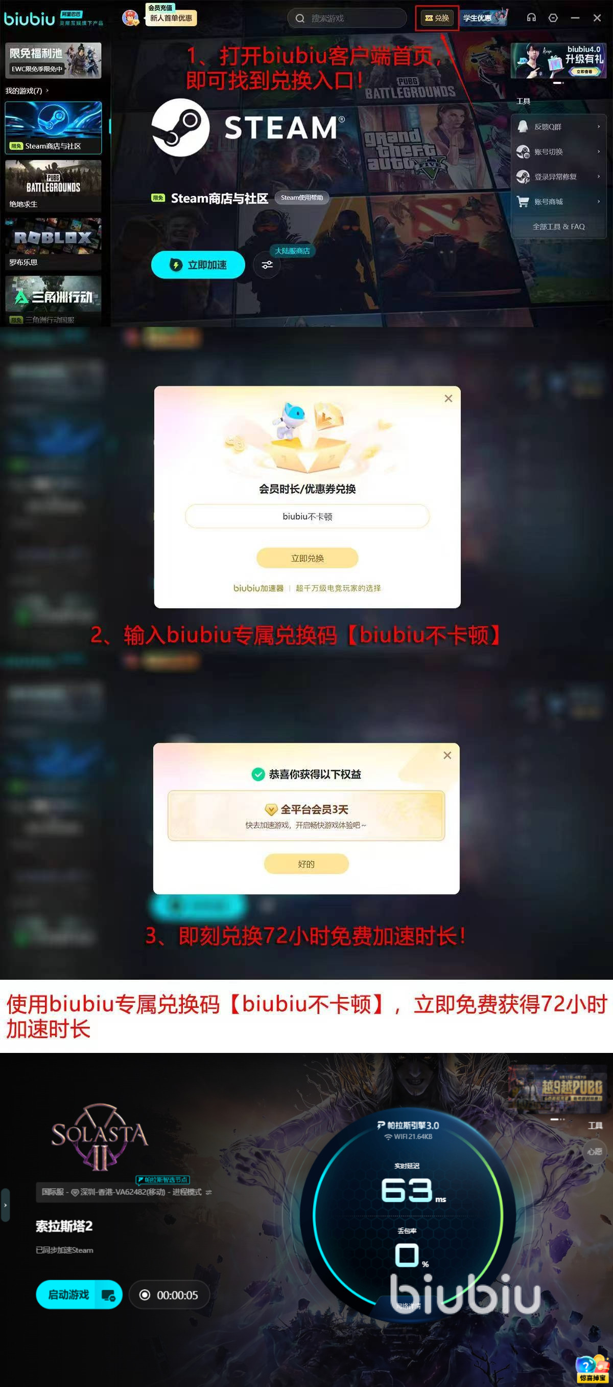 面向新用户,biubiu加速器提供阶梯式体验权益:完成注册即可解锁首日24小时全功能免费使用权;在激活界面输入专属口令【biubiu不卡顿】,还可额外获得72小时加速时长,累计可享连续96小时以上无限制服务,覆盖完整下载+初始游玩周期。