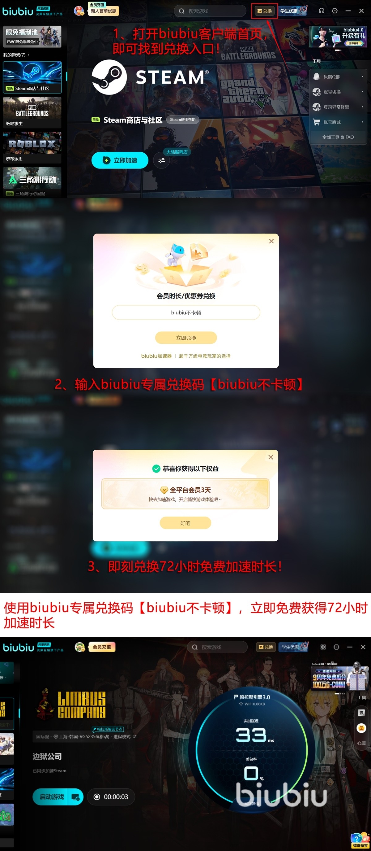 为了让更多的用户体验到biubiu的优势,现在官方特推出新人福利活动:新注册账号免费享受24小时加速服务。而各大新老用户,也可以使用【biubiu不卡顿】兑换口令,还能兑换3天的免费时长,不限制节点来体验,好不好用,亲自跑几局就知道。